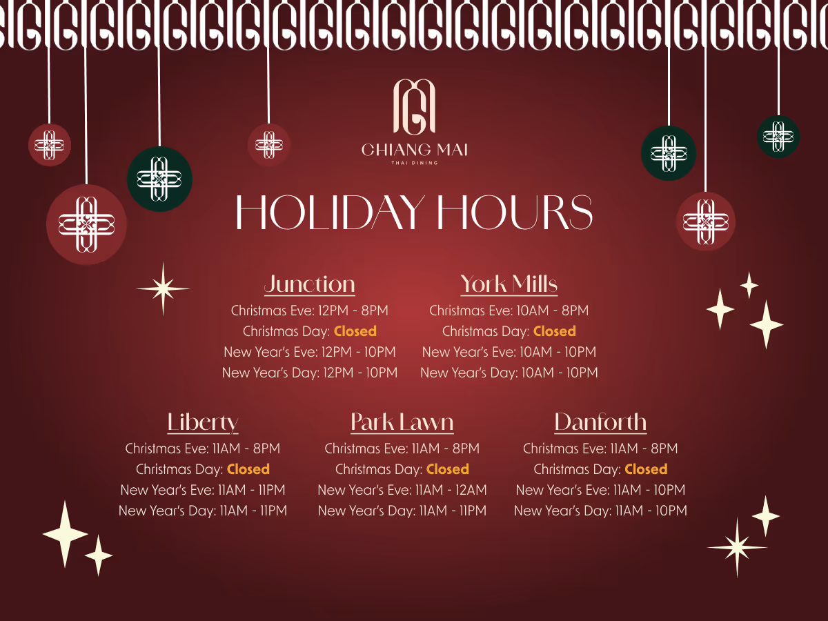 Discover Chiang Mai where each location boasts a unique ambiance. Enjoy the lively energy of some venues or the serene romance of others, all while indulging in our exquisite Thai cuisine and warm hospitality at each one of thai restaurant locations across Toronto.